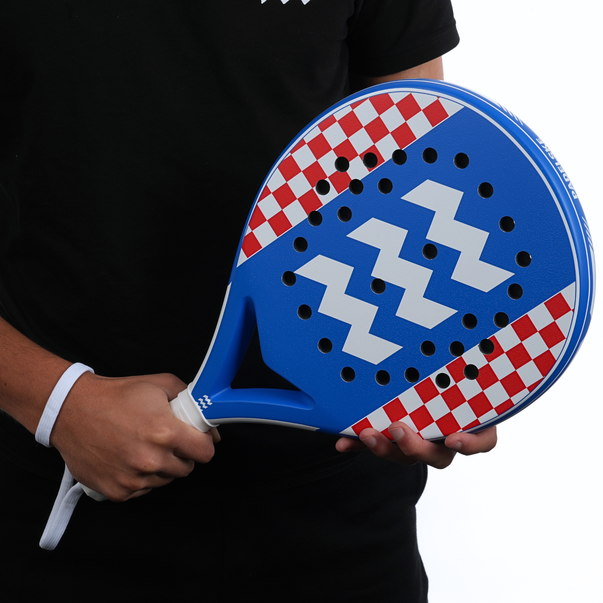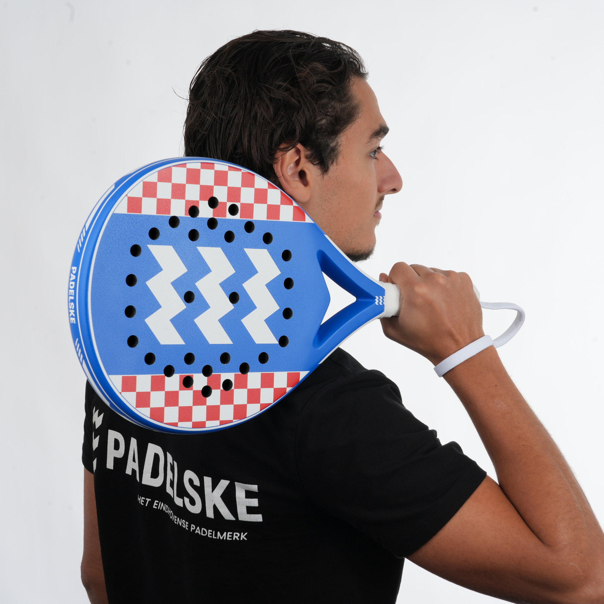 De ROODWITTER is speciaal ontworpen voor sportliefhebbers die hun clubtrots ook op de padelbaan willen laten zien. Het ontwerp is geïnspireerd door een modern voetbaluitshirt en straalt in stijlvol blauw met rood-witte accenten – een echte blikvanger voor wie sport in het hart draagt.